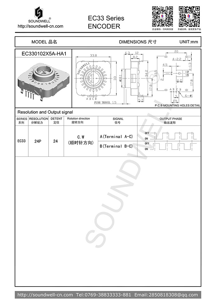 EC33增量型中空编码器优点:较长的使用寿命,内轴自带按压复位功能,可配合按压开关用。手感清脆,
