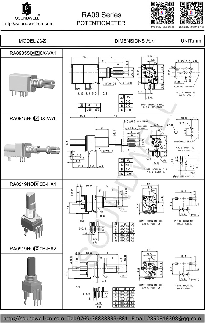 RA09电位器开关优点:采用塑封式结构,可有效应对波峰焊,产品密封性好,可以带定位,有带按压开关或旋转开关,轴长及形状可以调整,有多种安装方式供选择。
