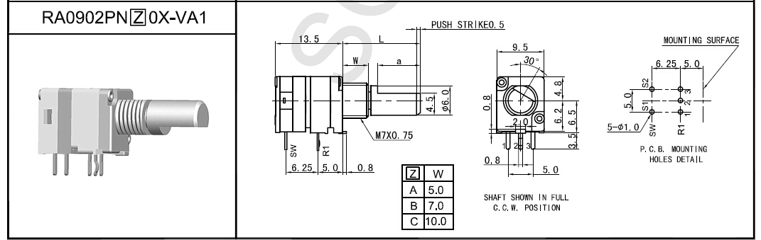 RA09电位器开关特点:采用塑封式结构,可有效应对波峰焊,产品密封性好,可以带定位,有带 按压开关或旋转开关,轴长及形状可以调整,有多种安装方式供选择