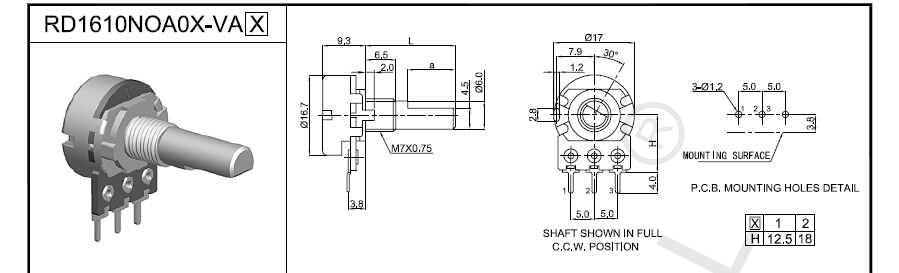 RD16旋转电位器特点:旋转手感柔和,性能稳定。轴心形状及长度、使用电路、安装方式可以选择,还可以选择带旋转开关功能。
