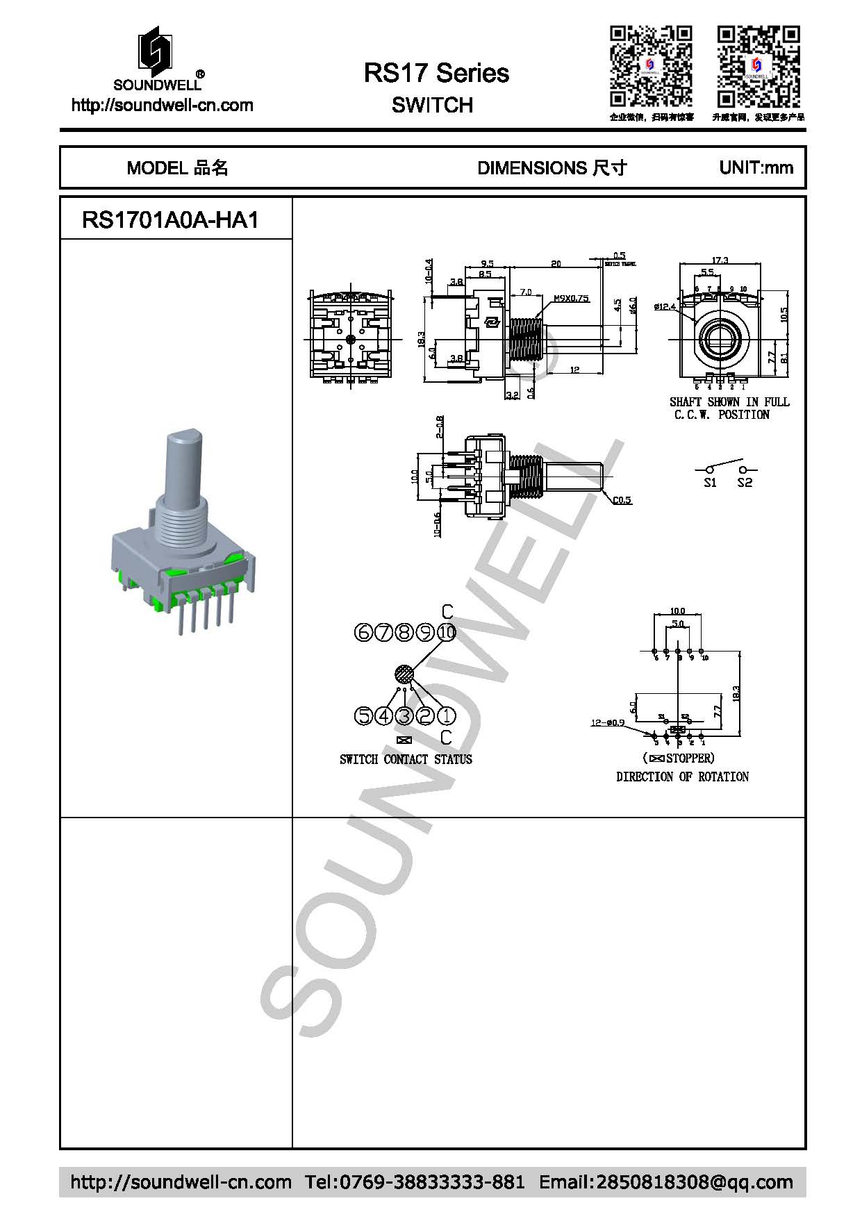 | Main Specifications: | Dimensions: 17mm Number of positions: 2~9 Step angle: 30°±3° Rated power: DC16V 0.3A Contact resistance: 100mΩ Max Rotational torque: 100~600gf.cm Switch operating force: 250~650gf Operating temperature: -10℃ ~70℃ Operating life: 10,000 cycles Min |