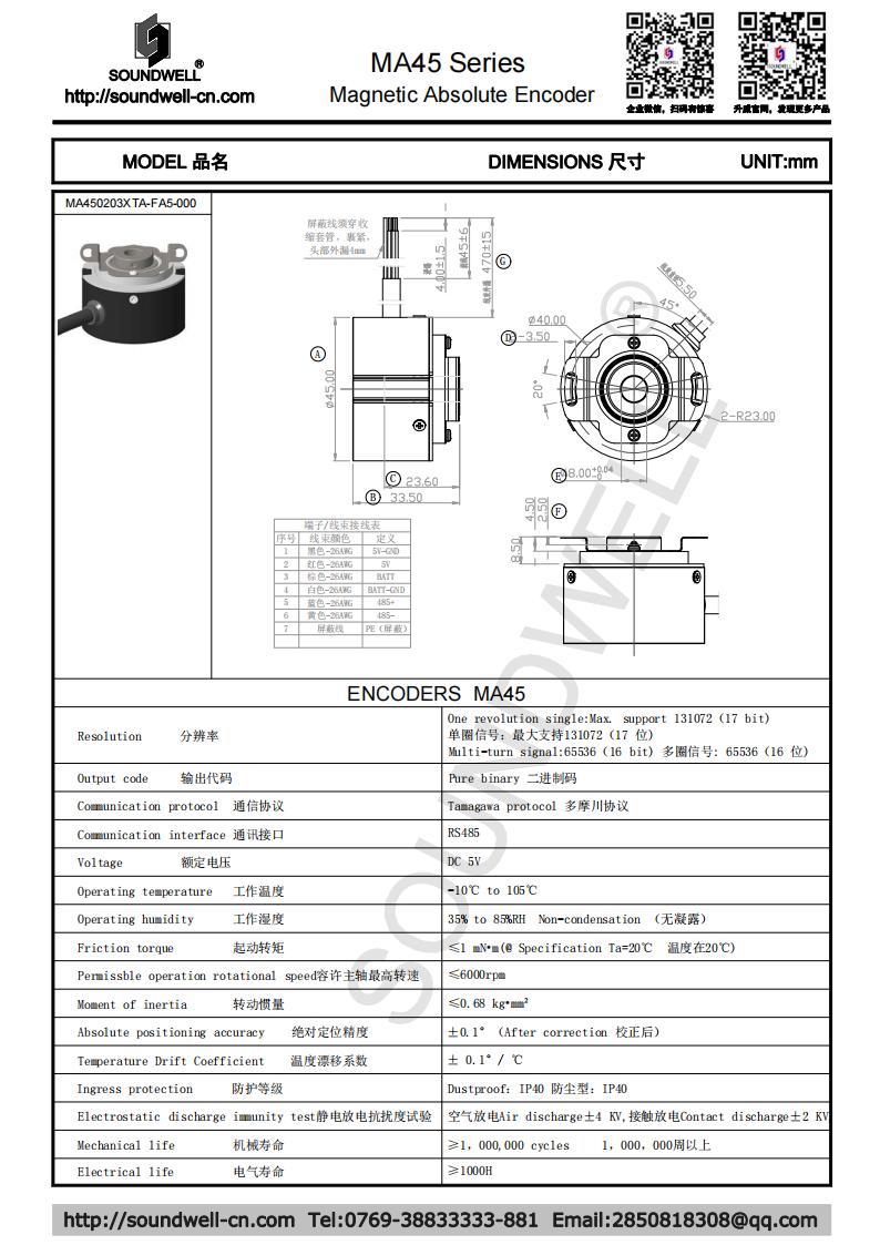 | 主要规格 | 外形尺寸:45 mm 编码器定位数:无极旋转 编码器输出分辨率:单圈17B,多圈16B 工作温度:-10℃~105℃ 输入电压:5V; 通讯接口:RS485 通信协议:多摩川 绝对定位精度:±0.1°(校正后) 温度漂移系数:± 0.1°/ ℃ 旋转寿命:1,000,000次以上 电气寿命:1000小时以上 |