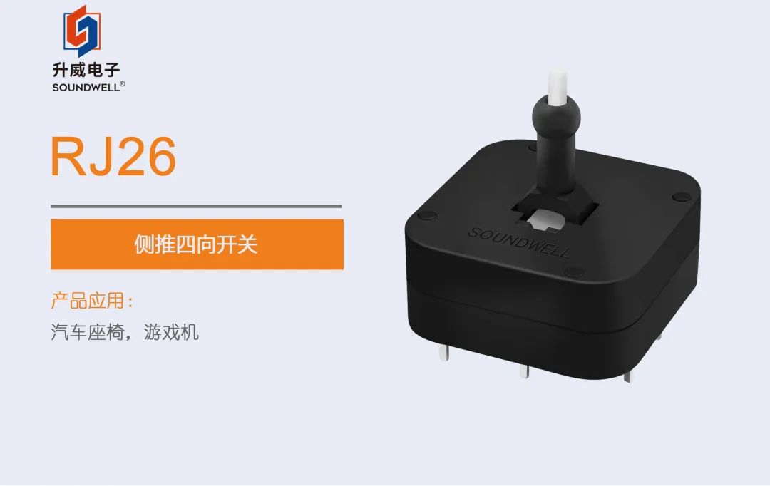除此以外,应用在汽车座椅调节的开关我们还有RJ26,它与RJ20最大的区别是一款侧推四向开关(中间无按压功能),可进行四个方向的调节。