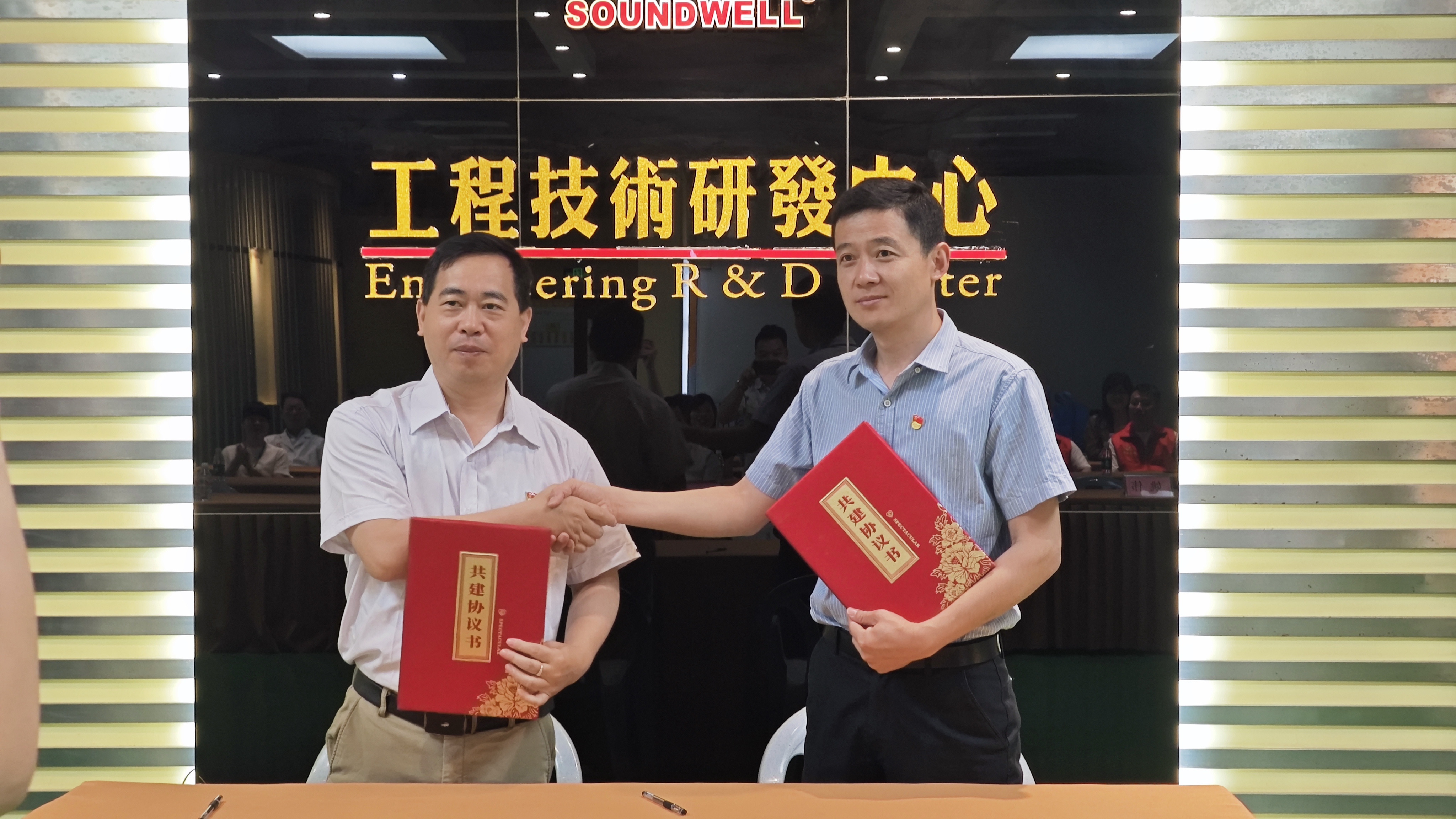 广东升威电子有限公司代表彭明亮书记、莞华医院代表姚伟书记上台签订《党建联学共建、健康联盟协议书》。
