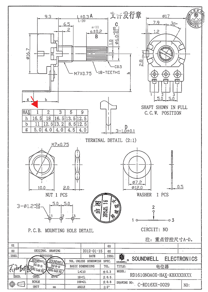 RD16单联旋转电位器特点:旋转手感柔和,性能稳定。轴心形状及长度、使用电路、安装方式可以选择,还可以选择带旋转开关功能。