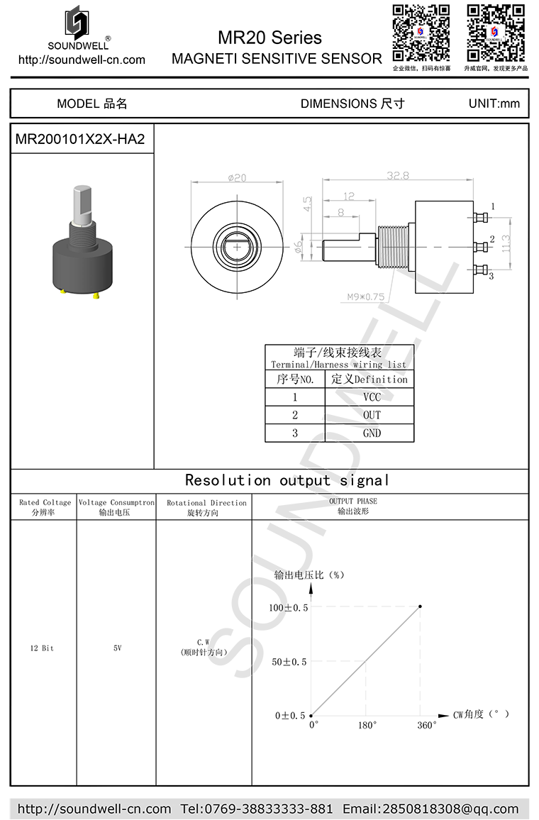 | 主要规格: | 工作电压:4.5~5.5V; 有效电气角度:360° 绝对线性精度:±0.5% 输出信号:单通道 0~100% Vcc 防护等级:IP65 |