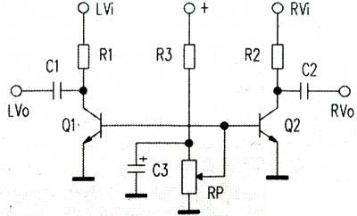 该电路是靠调节 Q1 、 Q2 的导通度来控制音量的。 Q1 、 Q2 的基极并联在一起,当调节 RP 时, Q1 、 Q2 的偏压会发生变化,其导通度也会随之改变,从而使输出电压发生变化,达到调节音量的目的。在这里 Q1 、 Q2 、 R1 、 R2 就相当于一个双联电位器,调节 RP 就可控制两个声道的输出。这样就实现了用单电位器控制双声道音量的目的。 R3 、 C3 是限流滤波电路,防止电源电压波动或突变时影响到 Q1 、 Q2 的偏压,否则会有噪声串入音频信号。