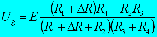 R1为应变片的阻值,工作时R1有一增量ΔR,当为拉伸应变时,ΔR为正;压缩应变时,ΔR为负。在上式中以R1+ΔR代替R1,则